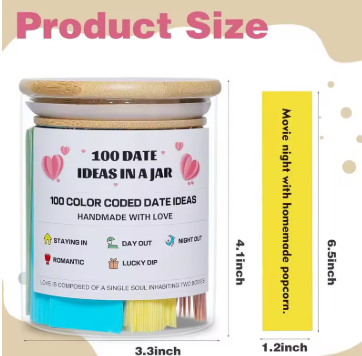 Inside each jar are 100 unique date ideas with a mix of romantic, adventurous, cozy and spontaneous moments. From candlelit dinners to fun challenges, every piece of paper inspires quality time and deeper connection with your partner.